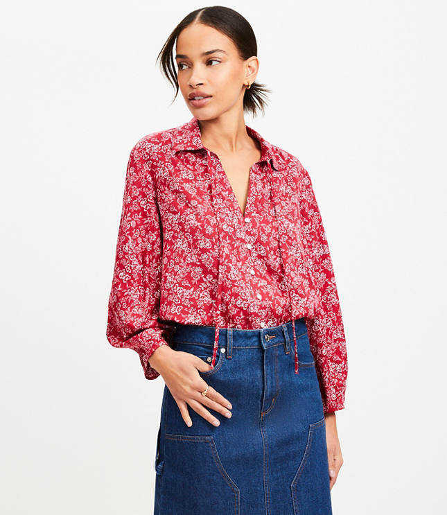 Feminine flutter sleeves and a touch of lace give this T Tahari printed flutter sleeve blouse ($24 at Bloomingdale's) in hibiscus red a real spring vibe. Pair with print crop pants and cute slides, or a tan pencil skirt, a coordinating print blazer, and low heels with a hint of embellishment.