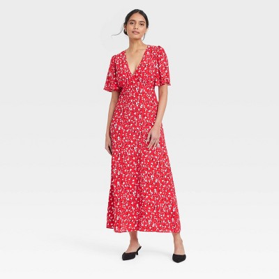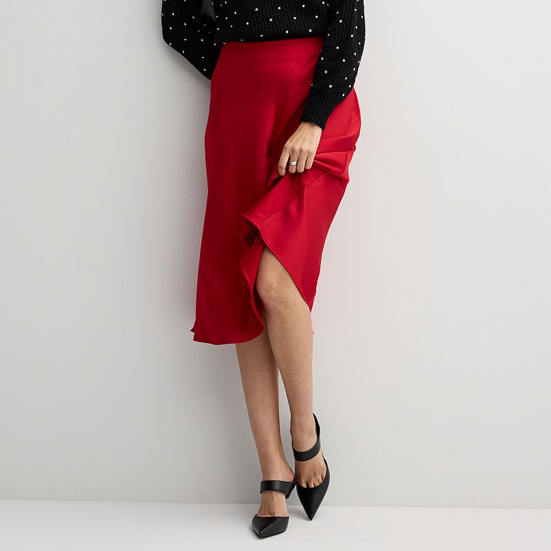 Delicate, light-colored floral print on a darker background is great for early spring, as in his A New Day short sleeve maxi sundress ($35 at Target) in red floral. The wrap bodice, raised waistline, and flared short sleeves give a warm weather feel without being as summery as a flowery sundress. Pair with a coordinating light blue or pale yellow cardigan and a straw tote bag for a cheery but cozy spring look.A solid red skirt, like this Nine West satin high waisted midi skirt ($35 at Kohl's) in fashion red, doesn't feel overly springy - unless you pair it with a pale colored blouse with a floral print including a touch of red and sandals with a subtle red hue.