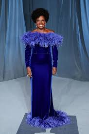 Jayme Lawson's electric blue fringed Loewe column gown featured a halter neckline and a flared peplum with a front point. The silhouette is curved but subtly so, and the pointed front of the peplum helps to minimize its volume. The color and texture of the fabric is stunning (fun fact: the fringe was 3-d printed!), and although I don't love the general style, I do like it.