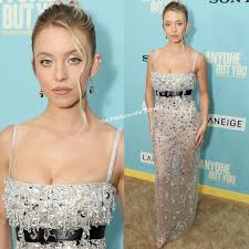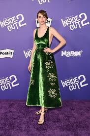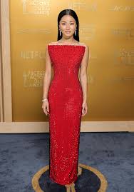 Mikey Madison wore a dark red satin sheath with a modified draped sweetheart bodice with tiny dropped shoulder straps and a wrapped skirt with a high slit and a short train. The dress was accented with tiny fabric leaves all over and a group of fabric flowers at one side of the bust. She accessorized with a short diamond necklace that was lovely, but a slightly longer length might have filled the space above the bodice better and looked more proportionate. But on the whole, a nice look.