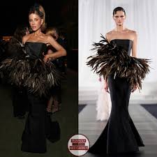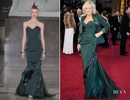 Demi Moore's custom Gucci strapless gown featured a green-and-black feathered sheath that flared at the knee into a short train, with a strapless bodice that was an explosion of long black feathers that framed her face. While I found the bodice feathers a little out of proportion, the overall look was
