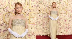 Ejae wore a custom Dior design by Jonathan Anderson. Her metallic gold strapless gown featured a wrapped bodice ending in a short trailing scarf and a longer side train, both trimmed with fringe, a deep front slit, and small black accents at the top of the bodice and on one hip. The silhouette was simple with interesting details and impeccable tailoring. An absolute win.