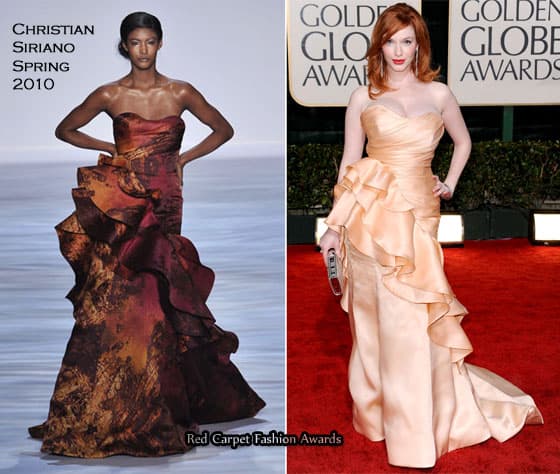 Ann Hathaway's strapless black floral-patterned Valentino trumpet gown was similar to the Dior gown worn by Rose Byrne. Hathaway's had a longer train and an overall floral pattern rather than localized embroidery, and Hathaway accessorized with black opera gloves and a shorter, heavier diamond necklace for a more dramatic effect. I loved both looks.