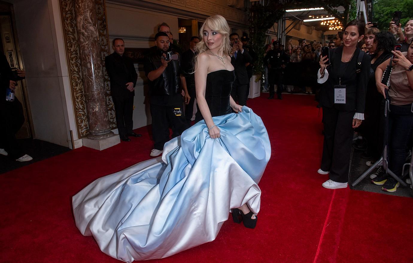 Audrey Nuna wore a custom Thom Browne ballgown with a long-sleeved, high-necked, metallic gold bodice and a multi-tiered full black skirt. The loved the line of tiny buttons on the bodice and the way the gold sequins trailed away at the waist and wrists. Nuna's looks are frequently too over-the-top for me, but I loved this look for her.